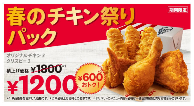ケンタッキーでは2月12日から3月10日まで「春のチキン祭りパック」を、期間限定で販売します。通常価格と比べて600円もおトク。