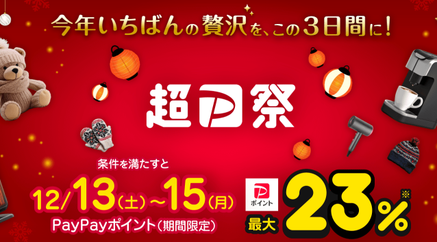 12月13~15日までヤフーショッピングで「超PayPay祭」を開催。