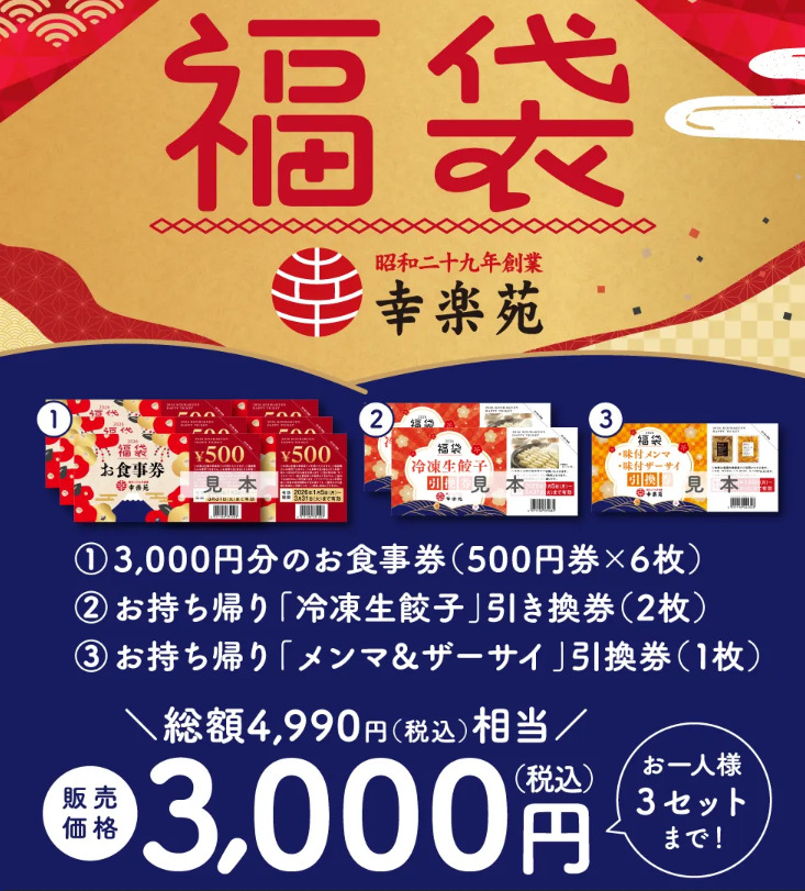11月24日10:00 〜12月7日まで幸楽苑公式サイトにて、福袋の予約を受付。
