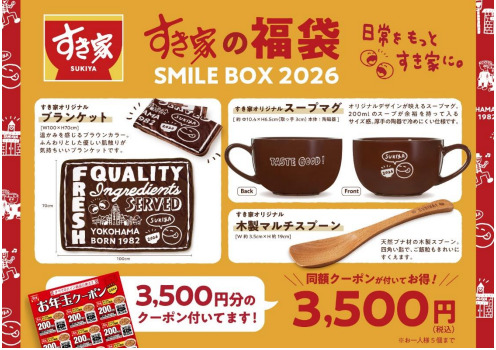 12月26日10時~すき家店舗にて福袋を発売。3,500円分のクーポンに加え、すき家オリ