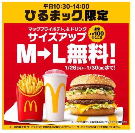 マクドナルドにて、セットの「マックフライポテト」Mサイズと「ドリンク」MサイズがそれぞれLサイズに無料(通常は+100円)でサイズアップできるキャンペーンを開催。