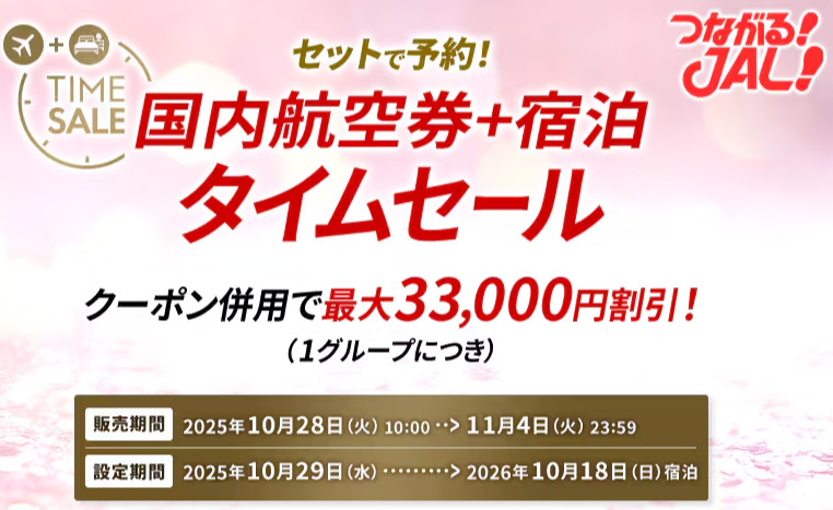 10月28日10時~11月4日まで、JALにて国内航空券+宿泊のタイムセールを開催します。