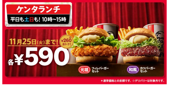 10月29日から11月25日まで、ケンタッキーにて「ケンタランチ」の人気バーガーセット2種、「チキンフィレバーガーセット」と「和風チキンカツバーガーセット」を各590円で販売。
