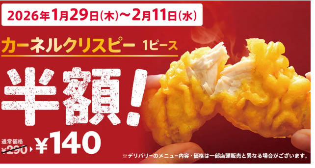 ケンタッキーにて「カーネルクリスピー」が半額。通常価格290円のところ、140円になります。