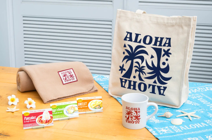 今回のラッキーバッグは、アロハデザインの「ハワイアントートバッグ」の中に、ふんわり生地の「ブランケット」や使い勝手の良い「マグカップ」、季節限定メニューを含む人気のお料理3種(ソフトドリンク付き)がお得にお楽しみいただける9,500円相当(最大・税込)の「ミールチケット」がセットになっています。