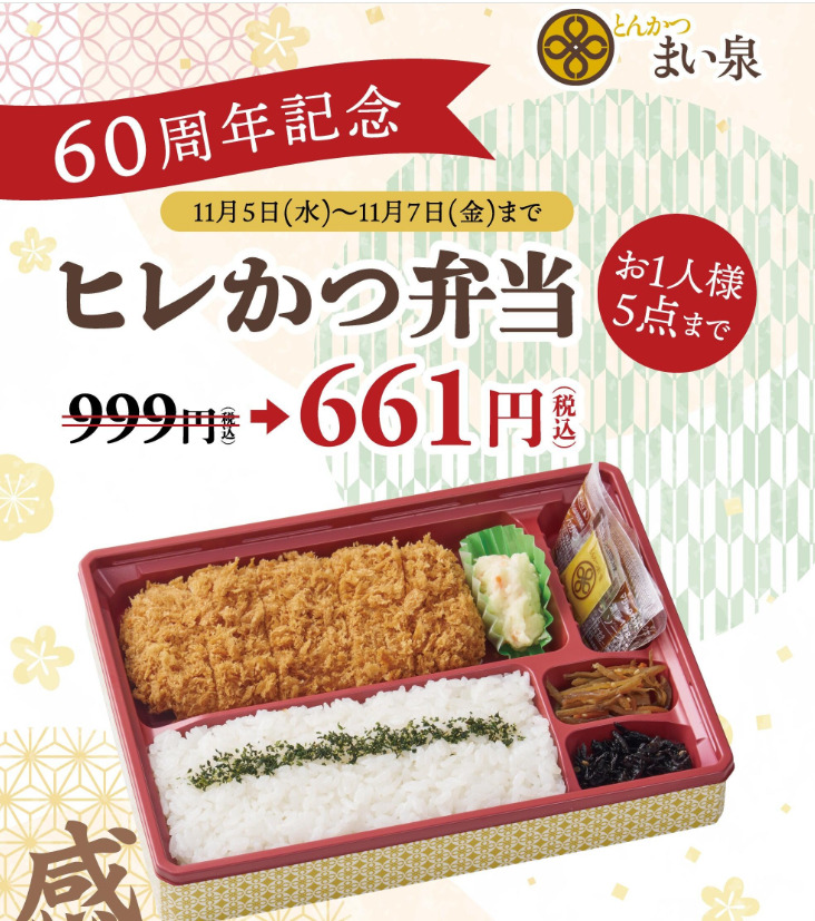 11月5日から7日までの3日間、まい泉直営販売店にて「ヒレかつ弁当」を特別価格で販売。