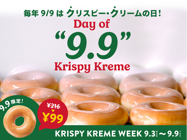 クリスピー・クリーム・ドーナツ全店舗にて、一番人気のオリジナル・グレーズド合計9,900個を通常価格216円のところ特別価格99円で販売します。