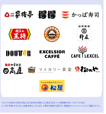 「家族亭」「得得」「とくとく」※1「かっぱ寿司」「餃子の王将」「サンマルクカフェ」「自家製麺 杵屋」「ドトールコーヒーショップ」※2「エクセルシオールカフェ」「カフェレクセル」「熱烈中華食堂 日高屋」「マイカリー食堂」「松や」「松屋」